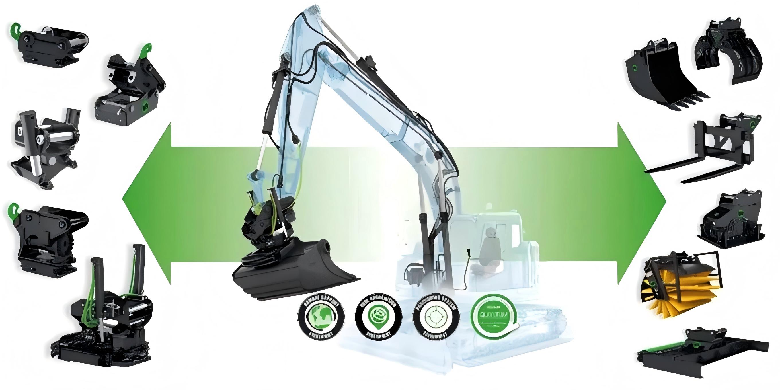 Hidravlik inteqrasiya olunmuş modul: Cənubi Koreyada Kyungwontech tərəfindən hazırlanan fırlanan sürətli birləşmə, aksesuarın 360 dərəcə fırlanmasına nail olmaq üçün yuxarı və alt komponentlər arasında dişli mexanizmi yayır. Məsələn, fırlanan bir çömçə ilə təchiz olunmuş bir sürüşmə ekskavatoru, bədənə təkrar düzəlişlərə ehtiyac olmadan yamacları kəsmək üçün yanaldan 65 dərəcə əymək olar.